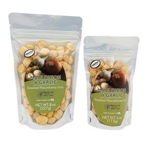 Macadamia nuts infused with real Maui onion's that give them a very zesty flavor. A classic mac nut flavor great nut for snacking or enjoying with your favorite beverage.