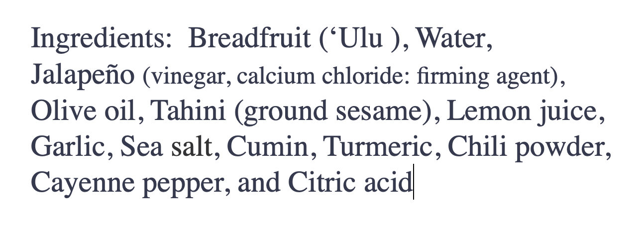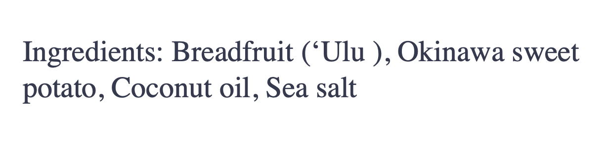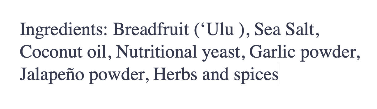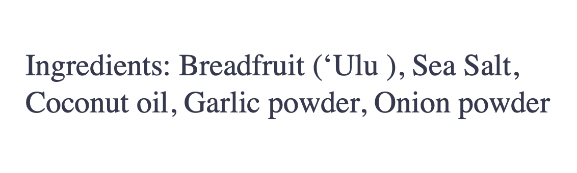 Our 'ulu chips are cooked in organic Coconut oil. Seasoned with high quality ingredients that we blend in house.